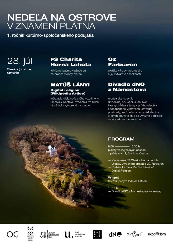 Organizátori 1. ročníka kultúrno - spoločenského podujatia ,,Nedeľa na ostrove v znamení plátna" Vás pozývajú na toto podujatie, ktoré sa uskutoční dňa 28. júla na Slanickom ostrove umenia.