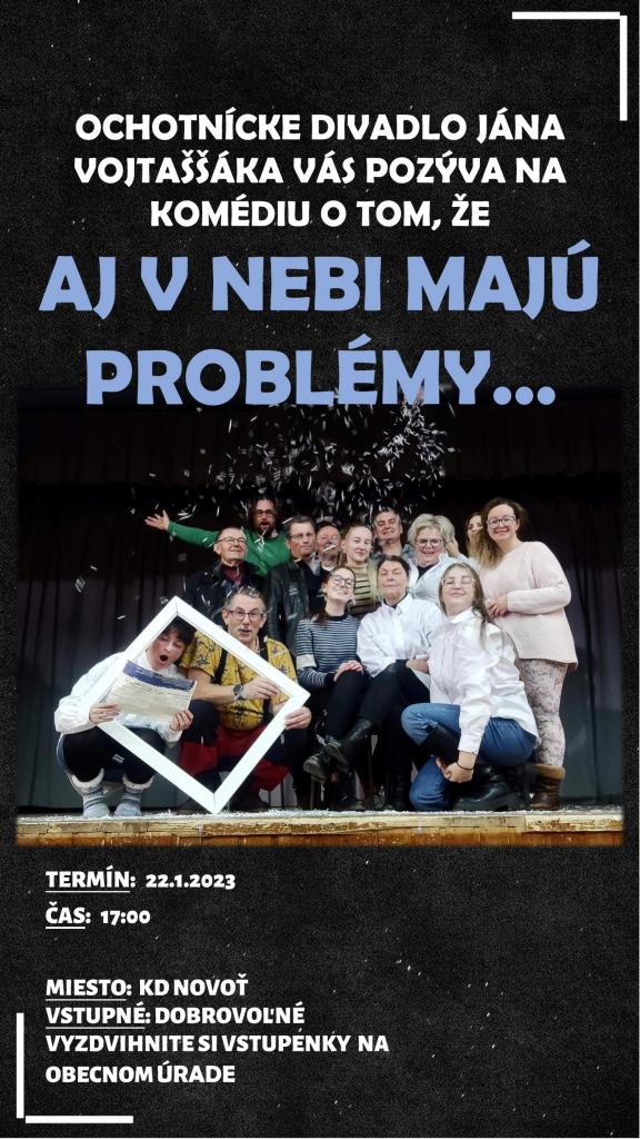 Ochotnícke divadlo Jána Vojtaššáka Vás pozýva na komédiu o tom, že ,,aj v nebi majú problémy..", ktoré sa uskutoční 22.01.2023 o 17:00 hodine v KD Novoť.