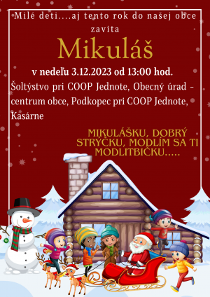 V nedeľu 3. decembra do našej obce zavíta Mikuláš, ktorý rád obdaruje všetky dobré a poslušné deti. Poteší ho malý darček v podobe krátkej básničky alebo pesničky.