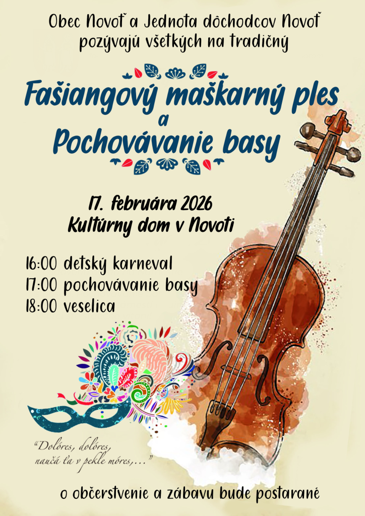 V spolupráci s Jednotou dôchodcov Novoť sme pre Vás pripravili kultúrny program spojený s fašiangovým maškarným plesom a tradičným pochovávaním basy.