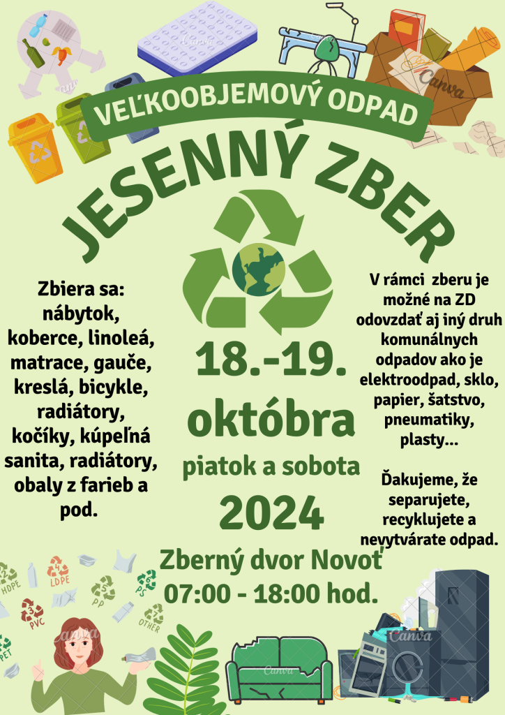 Oznamujeme, že budúci piatok a sobotu 18. -19. októbra 2024 bude na zbernom dvore Novoť prebiehať jesenný zber veľkoobjemového odpadu. Jedná sa o odpad väčších rozmerov, ktorý nie je možné vložiť do klasickej 110 l kuka nádoby.