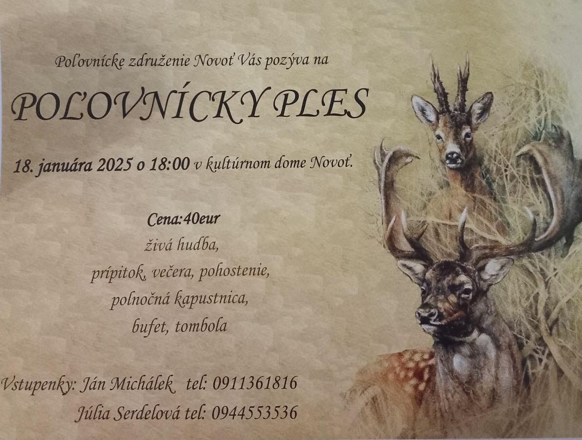 Poľovnícke združenie Novoť Vás pozýva na Poľovnícky ples 18. januára 2025 o 18:00 hod. v kultúrnom dome Novoť
