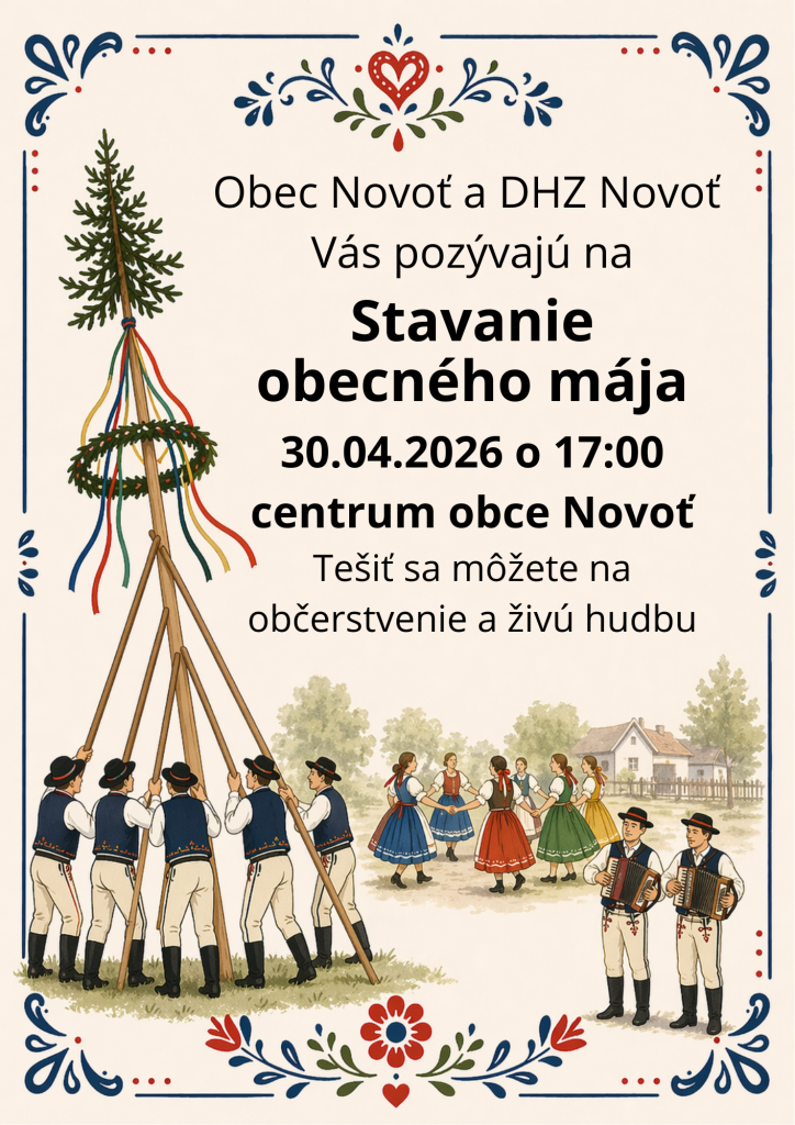 Pozvánka na tradičné stavanie obecného mája. Obec Novoť a DHZ Novoť Vás srdečne pozývajú na Stavanie obecného mája, ktoré sa uskutoční: -30. apríla 2026 -o 17:00 hod. -centrum obce Novoť Príďte si vychutnať príjemnú atmosféru, tradičné zvyky, občerstvenie a živú hudbu. Tešíme sa na Vás.